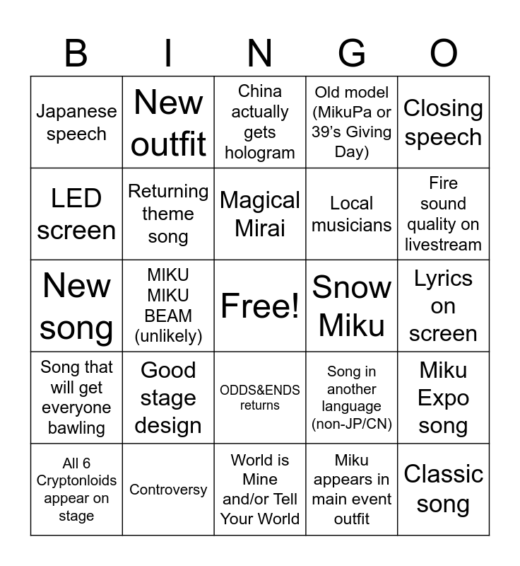This bingo card has a free space and 24 words: Good stage design, Controversy, Magical Mirai, All 6 Cryptonloids appear on stage, Closing speech, Japanese speech, LED screen, New outfit, Snow Miku, ODDS&ENDS returns, Local musicians, New song, Song in another language (non-JP/CN), Miku Expo song, Returning theme song, Miku appears in main event outfit, Lyrics on screen, China actually gets hologram, Fire sound quality on livestream, MIKU MIKU BEAM (unlikely), Classic song, Song that will get everyone bawling, Old model (MikuPa or 39’s Giving Day) and World is Mine and/or Tell Your World.