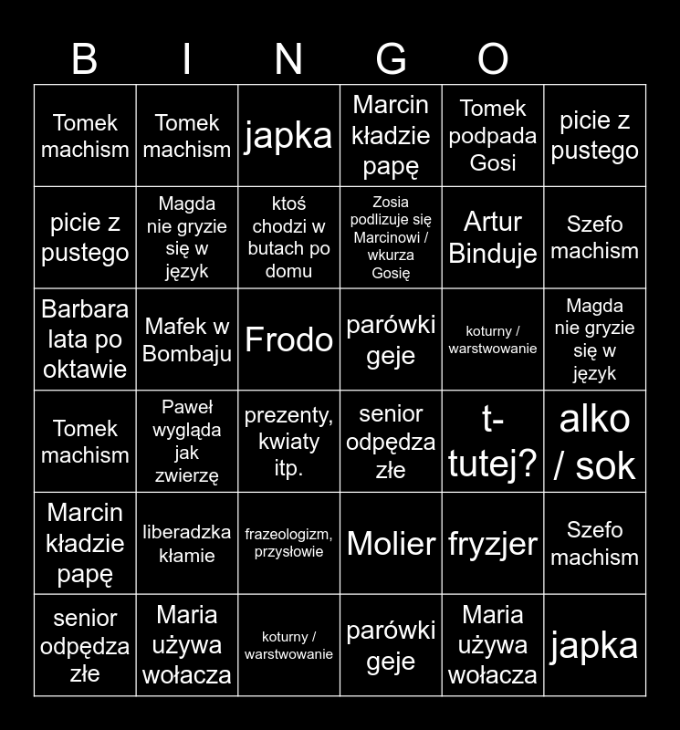 This bingo card has 95 words: picie z pustego, ktoś chodzi w butach po domu, alko / sok, koturny / warstowanie ubrań, ktoś dzwoni, japka, prezenty, kwiaty itp., senior odpędza złe, t-tutej?, Barbara lata po oktawie, Artur Binduje, Paweł wygląda jak zwierzę, Szefo machism, Magda nie gryzie się w język, Tomek podpada Gosi, Tomek machism, Zosia podlizuje się Marcinowi / wkurza Gosię, Mafek w Bombaju, Free!, Mafek lata po oktawie, rezolutne / sprytne dziecko, Kasia marszczy nos, parówki geje, Marcin odpływa, Marcin kładzie papę, picie z pustego, Molier, ktoś chodzi w butach po domu, alko / sok, interpunkcja z dupy , wielokropki …, koturny / warstwowanie, liberadzka kłamie, ktoś dzwoni, japka, prezenty, kwiaty itp., senior odpędza złe, t-tutej?, Barbara lata po oktawie, Artur Binduje, Maria używa wołacza, Paweł wygląda jak zwierzę, Szefo machism, Magda nie gryzie się w język, Tomek podpada Gosi, Tomek machism, Mafek w Bombaju, Mafek lata po oktawie, rezolutne / sprytne dziecko, Kasia marszczy nos, Frodo, parówki geje, Marcin odpływa, Marcin kładzie papę, frazeologizm, przysłowie, książka, wykrajanie, chrumkać, błąd, fryzjer, odwyk, picie z pustego, Molier, ktoś chodzi w butach po domu, alko / sok, interpunkcja z dupy , wielokropki …, koturny / warstwowanie, liberadzka kłamie, ktoś dzwoni, japka, prezenty, kwiaty itp., senior odpędza złe, t-tutej?, Barbara lata po oktawie, Artur Binduje, Maria używa wołacza, Paweł wygląda jak zwierzę, Szefo machism, Magda nie gryzie się w język, Tomek podpada Gosi, Tomek machism, Mafek w Bombaju, Mafek lata po oktawie, rezolutne / sprytne dziecko, Kasia marszczy nos, Frodo, parówki geje, Marcin odpływa, Marcin kładzie papę, frazeologizm, przysłowie, książka, wykrajanie, chrumkać, błąd, fryzjer and odwyk.