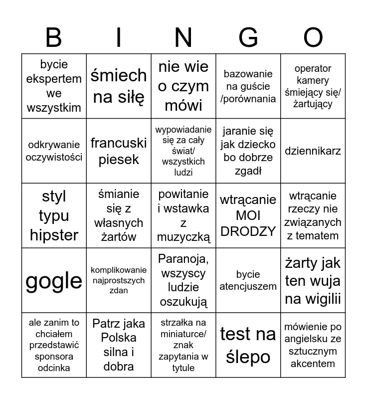 This bingo card has a free space and 24 words: komplikowanie najprostszych zdan, Patrz jaka Polska silna i dobra, wypowiadanie się za cały świat/ wszystkich ludzi, ale zanim to chciałem przedstawić sponsora odcinka, operator kamery śmiejący się/ żartujący, bycie ekspertem we wszystkim, odkrywanie oczywistości, śmiech na siłę, wtrącanie MOI DRODZY, Paranoja, wszyscy ludzie oszukują, jaranie się jak dziecko bo dobrze zgadł, styl typu hipster, bycie atencjuszem, żarty jak ten wuja na wigilii, francuski piesek, test na ślepo, wtrącanie rzeczy nie związanych z tematem, nie wie o czym mówi, dziennikarz, śmianie się z własnych żartów, mówienie po angielsku ze sztucznym akcentem, gogle, bazowanie na guście /porównania and strzałka na miniaturce/ znak zapytania w tytule.