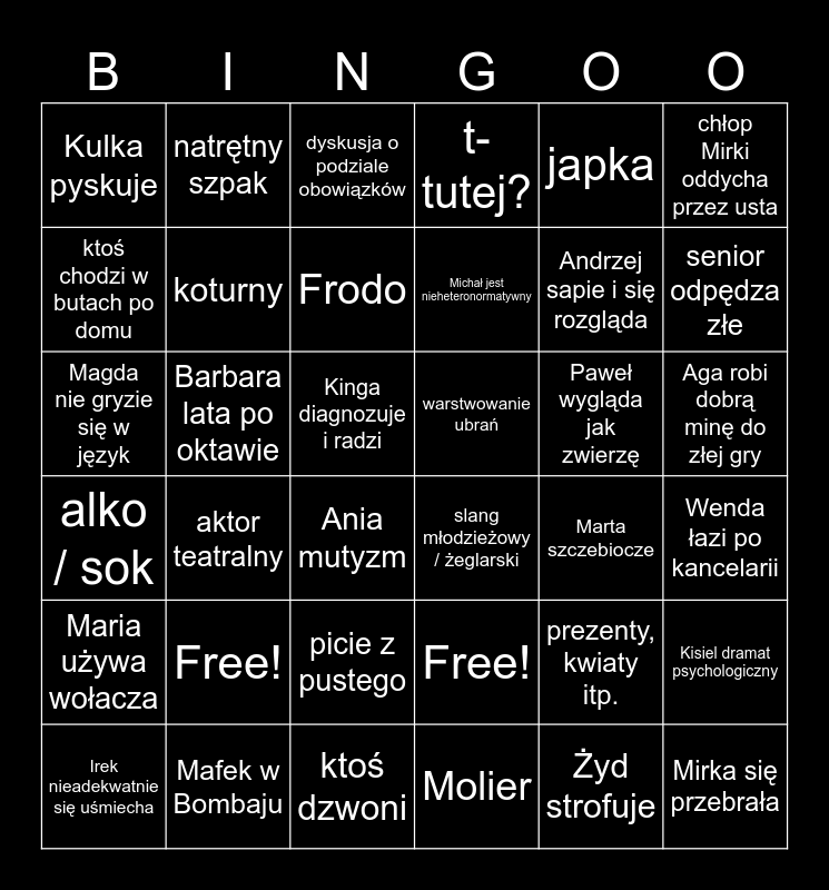 This bingo card has 36 words: Free!, picie z pustego, Molier, ktoś chodzi w butach po domu, alko / sok, warstwowanie ubrań, koturny, ktoś dzwoni, japka, prezenty, kwiaty itp., senior odpędza złe, t-tutej?, Kisiel dramat psychologiczny, Barbara lata po oktawie, Michał jest nieheteronormatywny, Kulka pyskuje, Maria używa wołacza, Paweł wygląda jak zwierzę, Magda nie gryzie się w język, dyskusja o podziale obowiązków, Kinga diagnozuje i radzi, aktor teatralny, slang młodzieżowy / żeglarski, Ania mutyzm, Marta szczebiocze, natrętny szpak, Andrzej sapie i się rozgląda, Mafek w Bombaju, Frodo, chłop Mirki oddycha przez usta, Mirka się przebrała, Irek nieadekwatnie się uśmiecha, Wenda łazi po kancelarii, Aga robi dobrą minę do złej gry, Free! and Żyd strofuje.