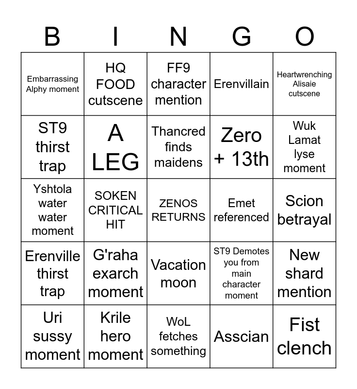 This bingo card has a free space and 24 words: G'raha exarch moment, Krile hero moment, Thancred finds maidens, Uri sussy moment, Heartwrenching Alisaie cutscene, Embarrassing Alphy moment, ST9 thirst trap, HQ FOOD cutscene, Emet referenced, Vacation moon, Zero + 13th, Yshtola water water moment, ST9 Demotes you from main character moment, New shard mention, A LEG, Asscian, Scion betrayal, FF9 character mention, Wuk Lamat lyse moment, SOKEN CRITICAL HIT, Fist clench, Erenville thirst trap, Erenvillain and WoL fetches something.