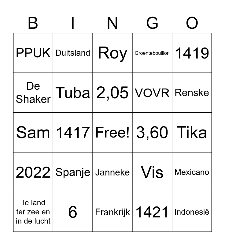 This bingo card has a free space and 50 words: Australië, Indonesië, Schotland, Frankrijk, Spanje, Turkije, Duitsland, Drums/Trommels, De Shaker, Piano, Tuba, Groentebouillon, Mexicano, Vis, Tomatensoep, Zongedroogde tomaat, 2,05, 3,60, 1418, 1419, 1417, 1421, PPUK, VOVR, BUBA, Sjoerd, Renske, Raymond, Roy, Janneke, Ron, 3, 4, 5, 6, 11, 19, 27, 28, Tika, GTST, TV kantine, Anne-Fien, Pauw, Te land ter zee en in de lucht, Sam, Linde, Ivo, 2022 and 2019.