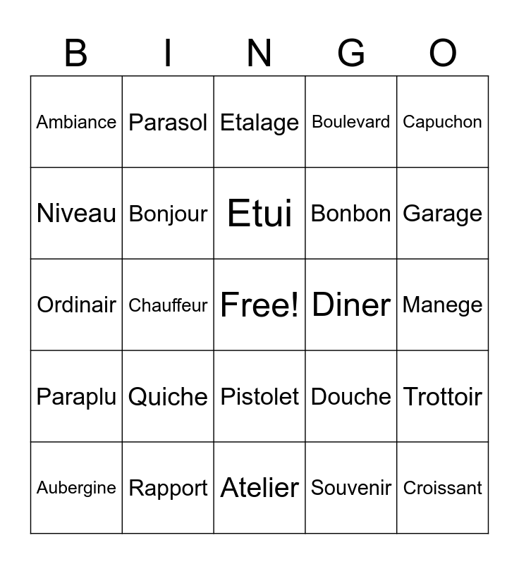 This bingo card has a free space and 56 words: Au revoir, Aubergine, Accent, Ambiance, Atelier, Baguette, Bonjour, Ballon, Bonbon, Bouillon, Boulevard, Bureau, Caissière, Cadeau, Café, Camping, Capuchon, Chauffeur, Crapuul, Croissant, Diner, Douane, Douche, Etalage, Entree, Etui, Finale, Fondue, Garage, Horloge, Humeur, Interessant, Jus ‘d Orange, Logeren, Manege, Niveau, Ordinair, Papier maché, Paraplu, Parasol, Pistolet, Populair, Privé, Punaise, Quarantaine, Quiche, Rapport, Ratatouille, Rebel, Sanitair, Souvenir, Stagiair, Surprise, Toilet, Trottoir and Visite.