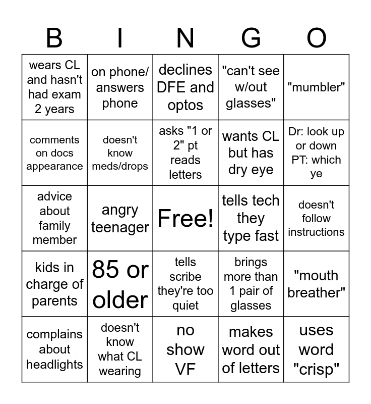 This bingo card has a free space and 24 words: 85 or older, doesn't know what CL wearing, asks "1 or 2" pt reads letters, complains about headlights, "mumbler", wears CL and hasn't had exam 2 years, comments on docs appearance, on phone/ answers phone, tells tech they type fast, tells scribe they're too quiet, wants CL but has dry eye, advice about family member, brings more than 1 pair of glasses, "mouth breather", doesn't know meds/drops, makes word out of letters, doesn't follow instructions, declines DFE and optos, Dr: look up or down PT: which ye, angry teenager, uses word "crisp", kids in charge of parents, "can't see w/out glasses" and no show VF.