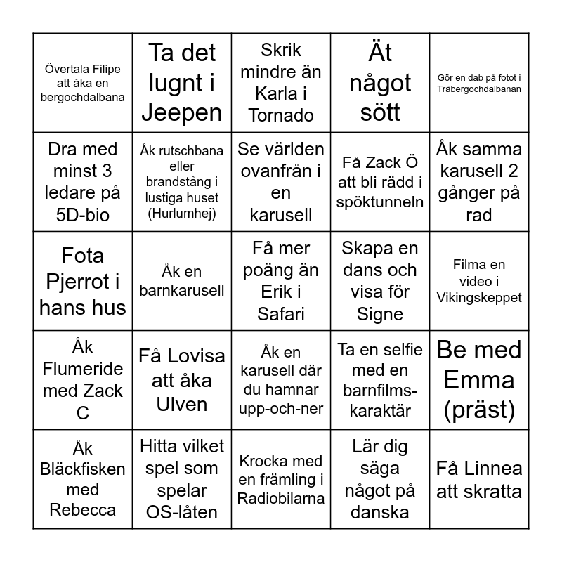 This bingo card has 25 words: Få Lovisa att åka Ulven, Krocka med en främling i Radiobilarna, Se världen ovanfrån i en karusell, Åk Bläckfisken med Rebecca, Gör en dab på fotot i Träbergochdalbanan, Övertala Filipe att åka en bergochdalbana, Dra med minst 3 ledare på 5D-bio, Ta det lugnt i Jeepen, Skapa en dans och visa för Signe, Åk en karusell där du hamnar upp-och-ner, Få Zack Ö att bli rädd i spöktunneln, Fota Pjerrot i hans hus, Ta en selfie med en barnfilms-karaktär, Be med Emma (präst), Åk rutschbana eller brandstång i lustiga huset (Hurlumhej), Få Linnea att skratta, Filma en video i Vikingskeppet, Skrik mindre än Karla i Tornado, Åk samma karusell 2 gånger på rad, Åk en barnkarusell, Få mer poäng än Erik i Safari, Hitta vilket spel som spelar OS-låten, Åk Flumeride med Zack C, Ät något sött and Lär dig säga något på danska.