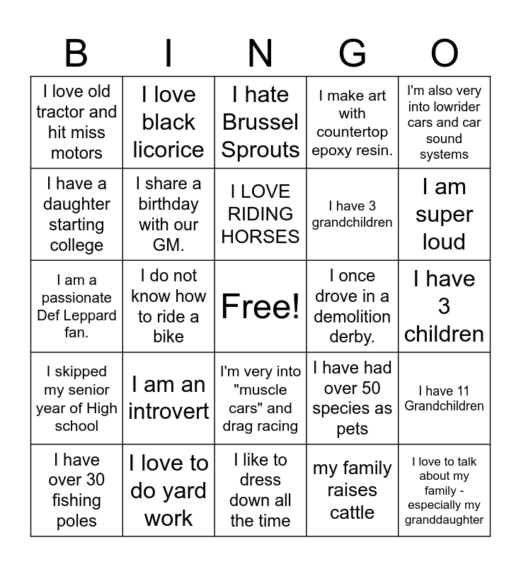 This bingo card has a free space and 35 words: I was a dancer for several years and performed at halftime shows., I love to play volleyball, LOVE TO TRAVEL, I share a birthday with our GM., I'm very into "muscle cars" and drag racing, I make art with countertop epoxy resin., I have a daughter starting college, I was on a state winning scholastic bowl team, I LOVE RIDING HORSES, I have lived in 8 states and went to 18 different schools, I am a passionate Def Leppard fan., I'm also very into lowrider cars and car sound systems, I HAD MOTORCYCLE LICENSE BEFORE GETTING DRIVERS LICENSE., I can laugh at myself (when I do crazy/dumb stuff), I love old tractor and hit miss motors, I once drove in a demolition derby., my family raises cattle, I do not know how to ride a bike, I skipped my senior year of High school, I love to talk about my family - especially my granddaughter, I have had over 50 species as pets, I have over 30 fishing poles, I have 11 Grandchildren, I love to do yard work, I hate Brussel Sprouts, I am super loud, I LOVE TO SWIM, I love to mow, I have 3 grandchildren, I have 3 children, My great great grandparents were Cherokee Native Indians, I like to dress down all the time, I am an introvert, I love black licorice and I have killed, cooked and eaten snapping turtle.