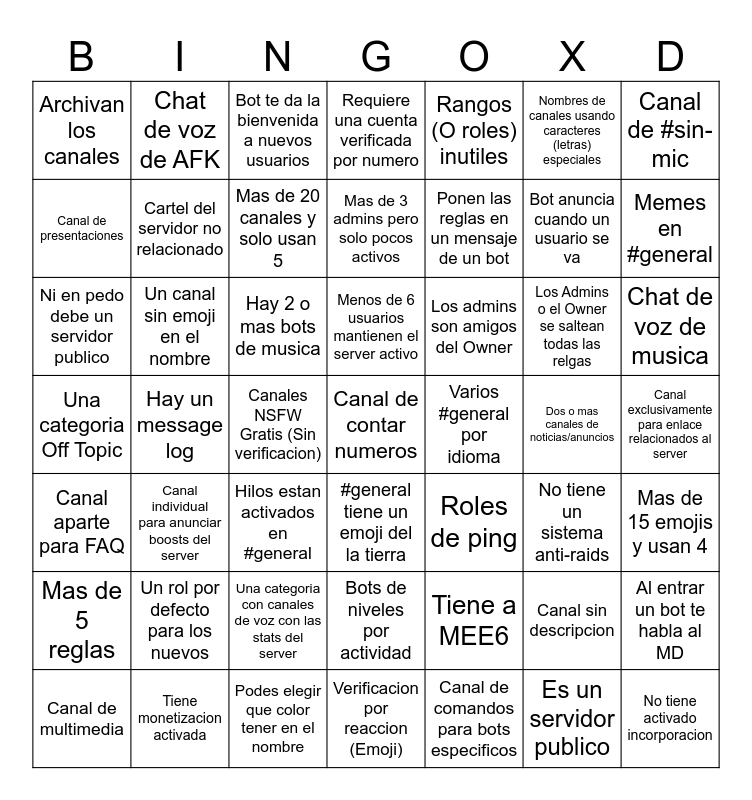 This bingo card has 49 words: Mas de 5 reglas, Un canal sin emoji en el nombre, Una categoria con canales de voz con las stats del server, #general tiene un emoji del la tierra, Los admins son amigos del Owner, Dos o mas canales de noticias/anuncios, Canal de #sin-mic, Canal de multimedia, Cartel del servidor no relacionado, Canales NSFW Gratis (Sin verificacion), Mas de 3 admins pero solo pocos activos, Rangos (O roles) inutiles, Bot anuncia cuando un usuario se va, Chat de voz de musica, Canal aparte para FAQ, Canal individual para anunciar boosts del server, Bot te da la bienvenida a nuevos usuarios, Menos de 6 usuarios mantienen el server activo, Canal de comandos para bots especificos, Nombres de canales usando caracteres (letras) especiales, Memes en #general, Canal de presentaciones, Chat de voz de AFK, Mas de 20 canales y solo usan 5, Verificacion por reaccion (Emoji), Ponen las reglas en un mensaje de un bot, Los Admins o el Owner se saltean todas las relgas, Al entrar un bot te habla al MD, Archivan los canales, Hay un message log, Podes elegir que color tener en el nombre, Bots de niveles por actividad, Roles de ping, Canal sin descripcion, Canal exclusivamente para enlace relacionados al server, Una categoria Off Topic, Un rol por defecto para los nuevos, Hilos estan activados en #general, Canal de contar numeros, Varios #general por idioma, Es un servidor publico, Mas de 15 emojis y usan 4, Ni en pedo debe un servidor publico, Tiene monetizacion activada, Hay 2 o mas bots de musica, Requiere una cuenta verificada por numero, Tiene a MEE6, No tiene un sistema anti-raids and No tiene activado incorporacion.