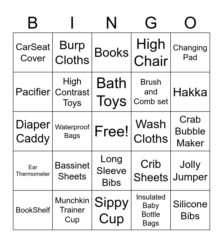 This bingo card has a free space and 52 words: Bath Accessories, Silicone Bibs, Bottle Warmer, Sippy Cup, Bassinet Sheets, Rattles, Burp Cloths, Clothes, Pacifier, Baby Memory Book, High Contrast Toys, Hooded Towel, Jolly Jumper, Crib Sheets, Teething Toys, Wipe warmer, Bath Toys, Wash Cloths, Bottle Brush, Changing Pad, Waterproof Bags, Insulated Baby Bottle Bags, CarSeat Cover, Brush and Comb set, Baby Rocker, Diaper Genie, Medela Quick Clean Bags, Swaddle Blanket Set, Hakka, Seat Protectors, Stroller Hooks, High Chair, Sound Machine, Humidifier, Snack Cup, Books, Munchkin Trainer Cup, Wrist and Foot rattle, Building Block Toy Set, Dishwasher Basket, Sorting Toy Set, Crab Bubble Maker, Ear Thermometer, Nursing Cover, Long Sleeve Bibs, Baby Gate, Stroller Organizer Caddy, Diaper Caddy, CarSeat Toys, OBall, BookShelf and Diaper Bag.