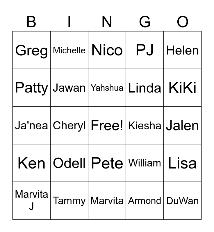 This bingo card has a free space and 24 words: Marvita J, Odell, Yahshua, Armond, Helen, Greg, Michelle, Nico, Kiesha, Jalen, Ja'nea, Jawan, William, Lisa, Patty, Tammy, Marvita, PJ, KiKi, Ken, Cheryl, Pete, Linda and DuWan.
