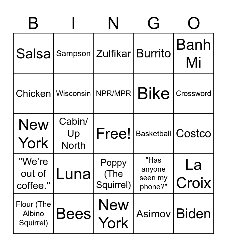 This bingo card has a free space and 26 words: Poppy (The Squirrel), Asimov, NPR/MPR, Bees, Banh Mi, Salsa, Chicken, Sampson, Costco, "Has anyone seen my phone?", Bike, New York, La Croix, Flour (The Albino Squirrel), Cabin/ Up North, "Cuddle Dog", Burrito, "We're out of coffee.", Zulfikar, Biden, Crossword, New York, Basketball, Luna, Wisconsin and College.