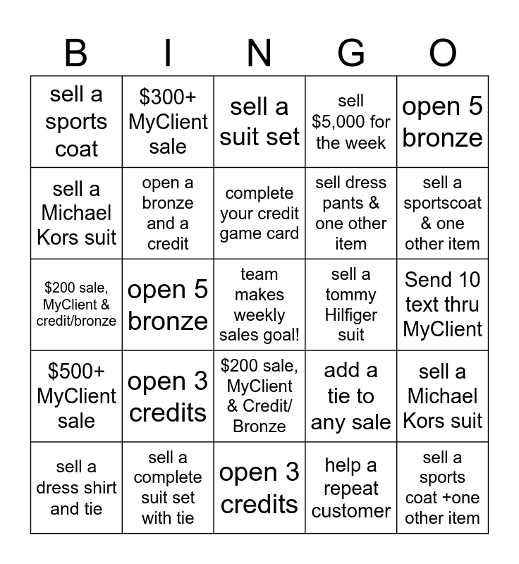 This bingo card has a free space and 24 words: open 3 credits, sell a complete suit set with tie, complete your credit game card, sell a dress shirt and tie, open 5 bronze, sell a sports coat, sell a Michael Kors suit, $300+ MyClient sale, sell a tommy Hilfiger suit, $200 sale, MyClient & Credit/ Bronze, sell dress pants & one other item, $200 sale, MyClient & credit/bronze, add a tie to any sale, sell a Michael Kors suit, open a bronze and a credit, help a repeat customer, Send 10 text thru MyClient, sell a suit set, sell a sportscoat & one other item, open 5 bronze, sell a sports coat +one other item, $500+ MyClient sale, sell $5,000 for the week and open 3 credits.