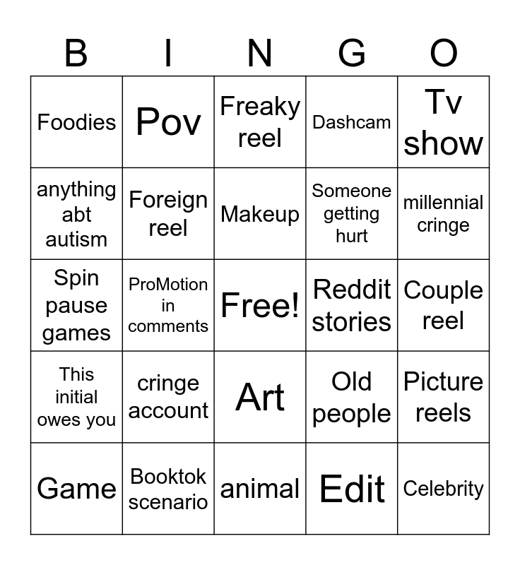 This bingo card has a free space and 24 words: cringe account, Booktok scenario, Makeup, Game, Tv show, Foodies, anything abt autism, Pov, Reddit stories, Art, Someone getting hurt, Spin pause games, Old people, Picture reels, Foreign reel, Edit, Couple reel, Freaky reel, millennial cringe, ProMotion in comments, Celebrity, This initial owes you, Dashcam and animal.
