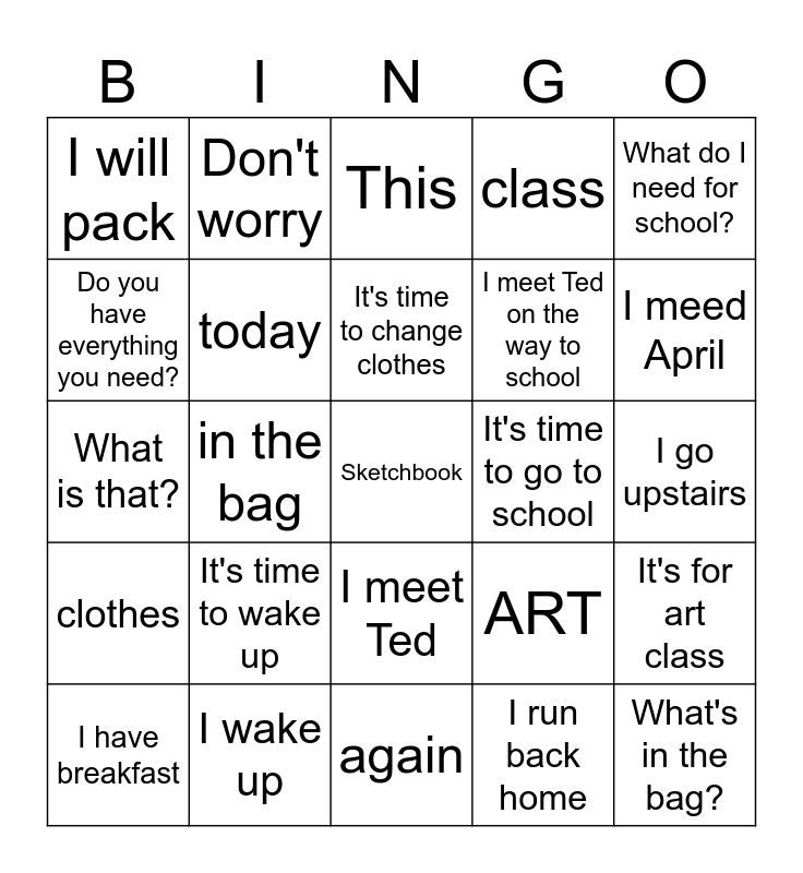 This bingo card has a free space and 24 words: It's time to wake up, I wake up, It's time to change clothes, I have breakfast, What do I need for school?, I will pack, Do you have everything you need?, Don't worry, It's time to go to school, I meet Ted, I meet Ted on the way to school, What is that?, ART, It's for art class, today, I run back home, I go upstairs, This, I meed April, in the bag, What's in the bag?, clothes, class and again.