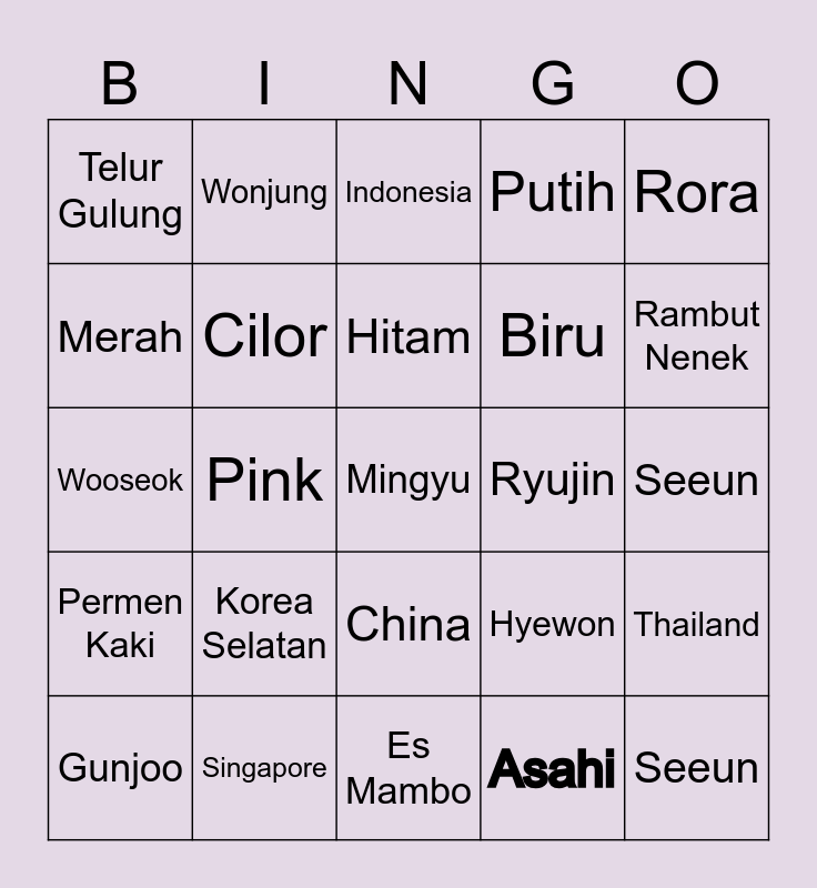 This bingo card has 25 words: Korea Selatan, Es Mambo, Hitam, Gunjoo, Rora, Telur Gulung, Merah, Wonjung, Ryujin, China, Biru, Wooseok, Hyewon, Thailand, Cilor, Seeun, Seeun, Indonesia, Rambut Nenek, Pink, Mingyu, Singapore, Permen Kaki, Putih and Asahi.