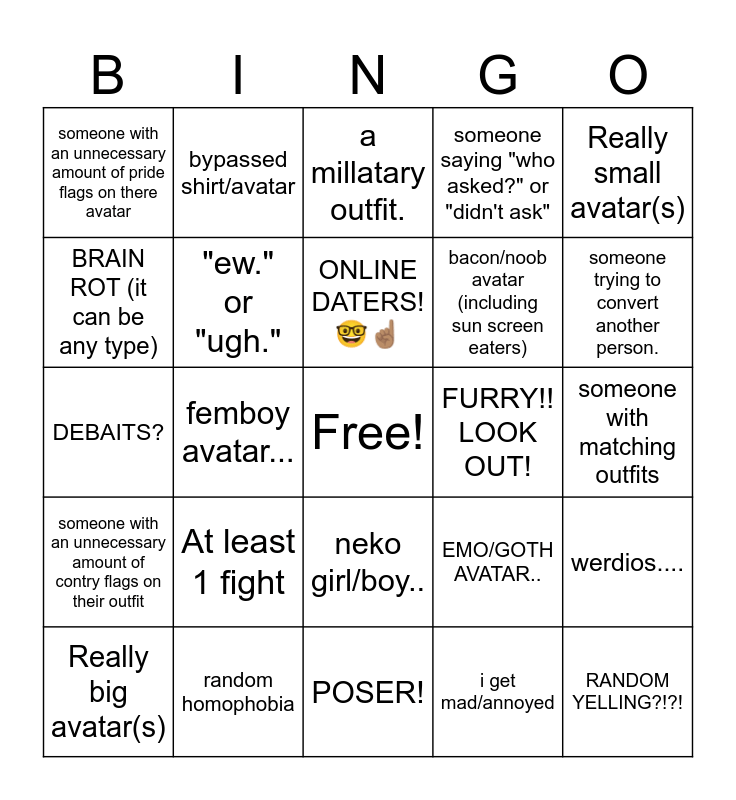 This bingo card has a free space and 24 words: At least 1 fight, random homophobia, ONLINE DATERS!🤓☝🏽, Really big avatar(s), Really small avatar(s), someone with an unnecessary amount of pride flags on there avatar, BRAIN ROT (it can be any type), bypassed shirt/avatar, FURRY!! LOOK OUT!, neko girl/boy.., bacon/noob avatar (including sun screen eaters), DEBAITS?, EMO/GOTH AVATAR.., werdios...., "ew." or "ugh.", i get mad/annoyed, someone with matching outfits, a millatary outfit., someone trying to convert another person., femboy avatar..., RANDOM YELLING?!?!, someone with an unnecessary amount of contry flags on their outfit, someone saying "who asked?" or "didn't ask" and POSER!.