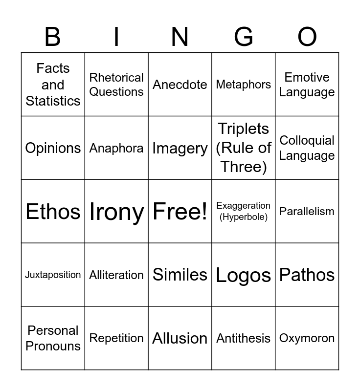 This bingo card has a free space and 24 words: Alliteration, Repetition, Imagery, Personal Pronouns, Emotive Language, Facts and Statistics, Opinions, Rhetorical Questions, Exaggeration (Hyperbole), Similes, Triplets (Rule of Three), Ethos, Logos, Pathos, Anaphora, Antithesis, Parallelism, Anecdote, Colloquial Language, Irony, Oxymoron, Juxtaposition, Metaphors and Allusion.