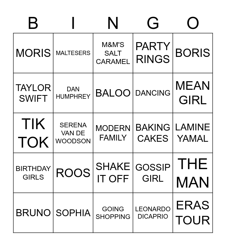 This bingo card has a free space and 24 words: ROOS, SOPHIA, BALOO, BRUNO, BORIS, MORIS, TAYLOR SWIFT, MALTESERS, BAKING CAKES, SHAKE IT OFF, DANCING, TIK TOK, GOSSIP GIRL, THE MAN, DAN HUMPHREY, LEONARDO DICAPRIO, LAMINE YAMAL, M&M'S SALT CARAMEL, MEAN GIRL, SERENA VAN DE WOODSON, ERAS TOUR, BIRTHDAY GIRLS, PARTY RINGS and GOING SHOPPING.