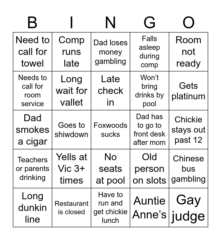This bingo card has a free space and 24 words: Yells at Vic 3+ times, Restaurant is closed, Late check in, Long dunkin line, Room not ready, Need to call for towel, Needs to call for room service, Comp runs late, Dad has to go to front desk after mom, No seats at pool, Won’t bring drinks by pool, Dad smokes a cigar, Old person on slots, Chinese bus gambling, Long wait for vallet, Auntie Anne’s, Chickie stays out past 12, Dad loses money gambling, Gets platinum, Goes to shiwdown, Gay judge, Teachers or parents drinking, Falls asleep during comp and Have to run and get chickie lunch.