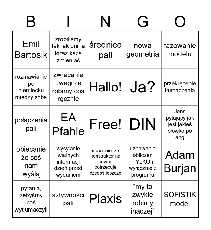 This bingo card has a free space and 24 words: wysyłanie ważnych informacji dzień przed wydaniem, sztywności pali, Hallo!, pytania, żebyśmy coś wytłumaczyli, fazowanie modelu, Emil Bartosik, rozmawianie po niemiecku między sobą, zrobiliśmy tak jak oni, a teraz każą zmieniać, DIN, mówienie, że konstruktor na pewno potrzebuje czegoś jeszcze, Ja?, połączenia pali, uznawanie obliczeń TYLKO i wyłącznie z programu, Adam Burjan, zwracanie uwagi że robimy coś ręcznie, "my to zwykle robimy inaczej", Jens pytający jak jest jakieś słówko po ang, średnice pali, przekręcenie tłumaczenia, EA Pfahle, SOFiSTiK model, obiecanie że coś nam wyślą, nowa geometria and Plaxis.