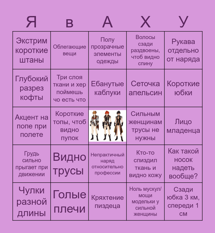 This bingo card has a free space and 24 words: Видно трусы, Голые плечи, Ебанутые каблуки, Чулки разной длины, Рукава отдельно от наряда, Экстрим короткие штаны, Глубокий разрез кофты, Облегающие вещи, Сильным женщинам трусы не нужны, Непрактичный наряд относительно профессии, Сеточка апельсин, Акцент на попе при полете, Кто-то спиздил ткань и видно кожу, Как такой носок надеть вообще?, Три слоя ткани и хер поймешь чо есть что, Ноль мускул/мощи модельки у сильной женщины, Лицо младенца, Полу прозрачные элементы одежды, Короткие юбки, Короткие топы, чтоб видно пупок, Сзади юбка 3 км, спереди 1 см, Грудь сильно прыгает при движении, Волосы сзади раздвоены, чтоб видно спину and Кряхтение пиздеца.