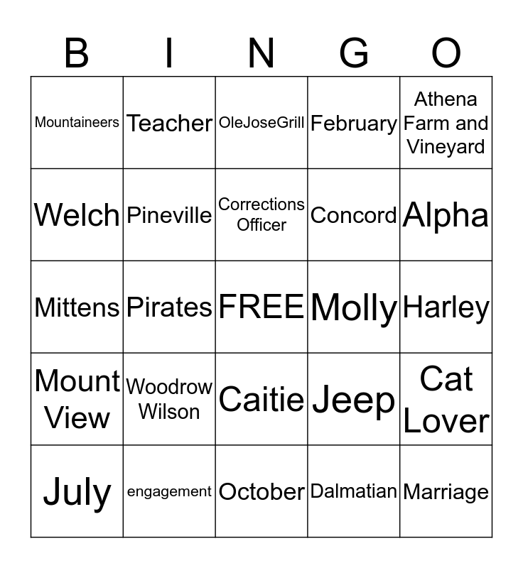 This bingo card has a free space and 24 words: Woodrow Wilson, engagement, Corrections Officer, July, Athena Farm and Vineyard, Mountaineers, Welch, Teacher, Molly, Caitie, Concord, Mittens, Jeep, Cat Lover, Pineville, Dalmatian, Harley, OleJoseGrill, Alpha, Pirates, Marriage, Mount View, February and October.