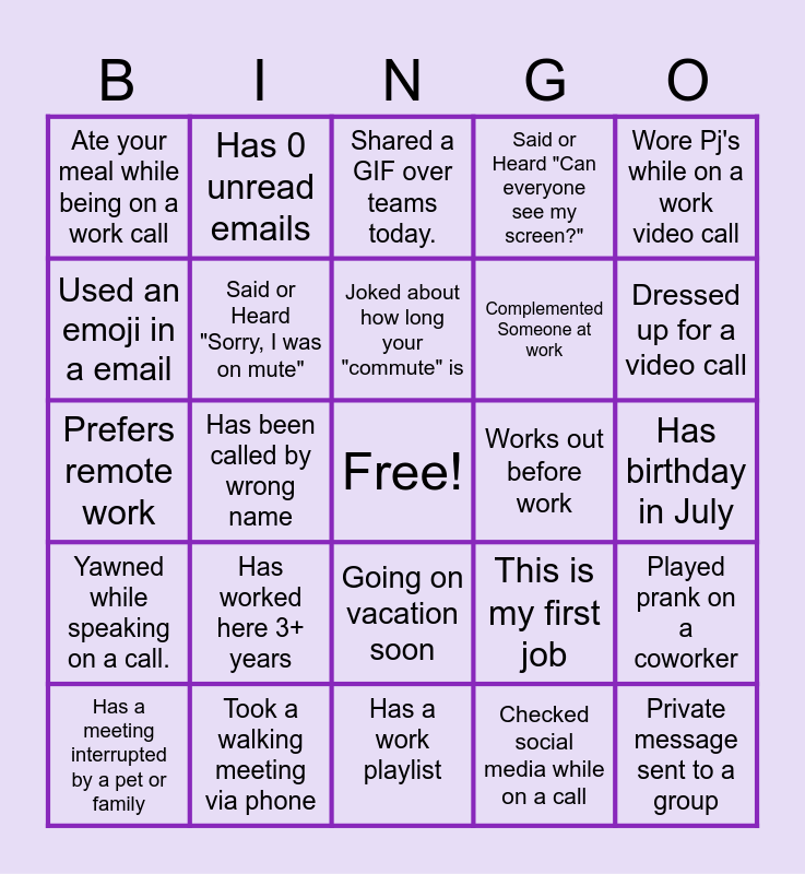 This bingo card has a free space and 24 words: Has worked here 3+ years, Took a walking meeting via phone, Joked about how long your "commute" is, Has a meeting interrupted by a pet or family, Wore Pj's while on a work video call, Ate your meal while being on a work call, Used an emoji in a email, Has 0 unread emails, Works out before work, Going on vacation soon, Complemented Someone at work, Prefers remote work, This is my first job, Played prank on a coworker, Said or Heard "Sorry, I was on mute", Checked social media while on a call, Has birthday in July, Shared a GIF over teams today., Dressed up for a video call, Has been called by wrong name, Private message sent to a group, Yawned while speaking on a call., Said or Heard "Can everyone see my screen?" and Has a work playlist.