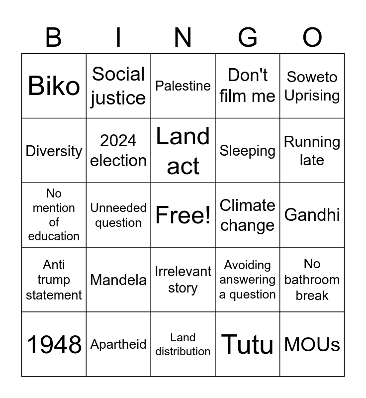 This bingo card has a free space and 24 words: Mandela, Apartheid, Land act, 1948, Soweto Uprising, Biko, Diversity, Social justice, Climate change, Irrelevant story, Sleeping, No mention of education, Avoiding answering a question, No bathroom break, 2024 election, Tutu, Gandhi, Palestine, Running late, Unneeded question, MOUs, Anti trump statement, Don't film me and Land distribution.