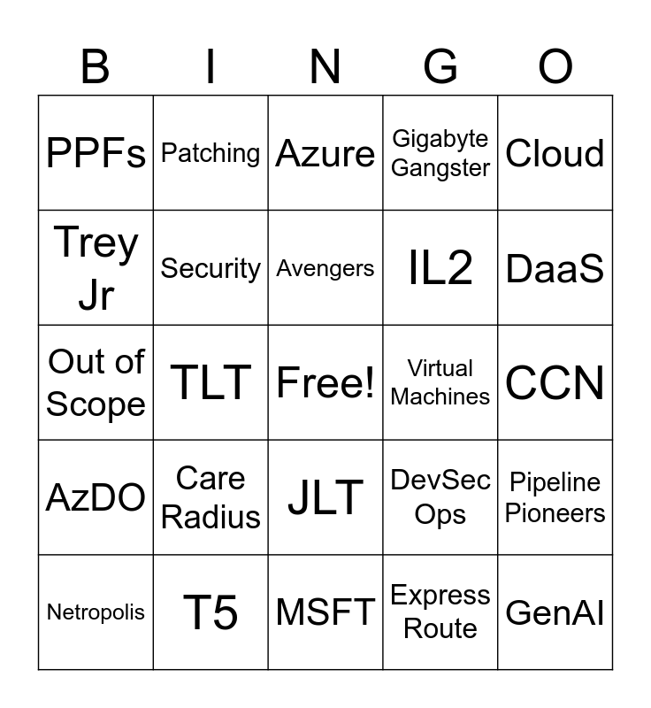 This bingo card has a free space and 30 words: T5, Hosting, TLT, Network, PPFs, Azure, Security, JLT, Virtual Machines, MSFT, CCN, GenAI, Express Route, CMP, DaaS, Phoenix, DevSec Ops, AzDO, Care Radius, Cloud, Out of Scope, SNOW, Patching, IL2, Trey Jr, Gigabyte Gangster, Pipeline Pioneers, Netropolis, Avengers and IL4.