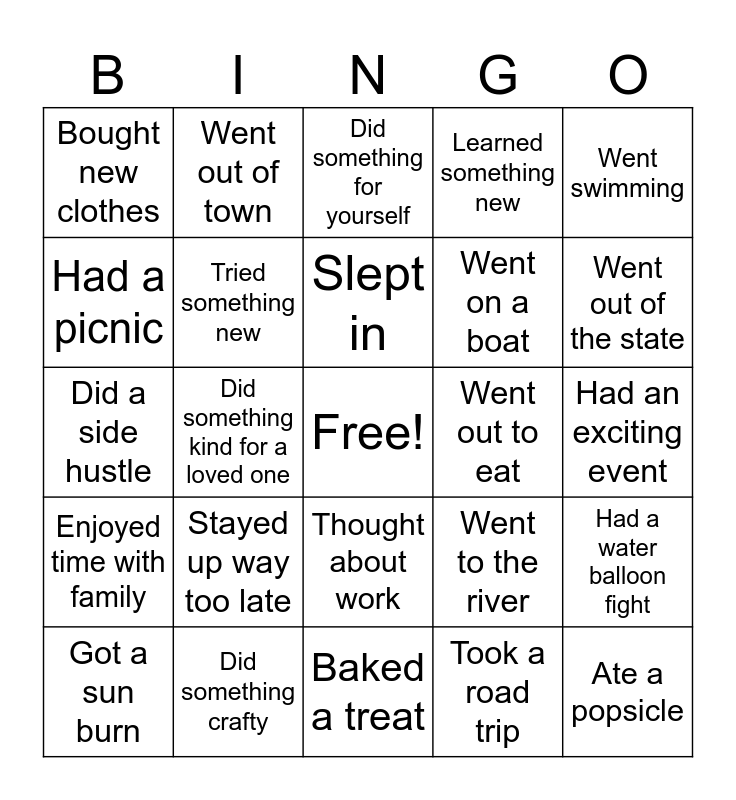 This bingo card has a free space and 34 words: Went to the beach, Took a road trip, Read a book, Watched a movie, Enjoyed time with family, Tried something new, Went swimming, Got a sun burn, Went out of town, Saw a coworker, Slept in, Did something for yourself, Did a random act of kindness, BBQ’d, Went out to eat, Went out of the state, Did something crafty, Did a side hustle, Stayed up way too late, Went to the river, Thought about work, Planned a lesson/activity, Bought new clothes, Had an exciting event, Baked a treat, Ate a popsicle, Learned something new, Sat around a campfire/firepit, Went on a boat, Had a picnic, Attend a sporting event, Did something kind for a loved one, Had a water balloon fight and Went to a yard sale.