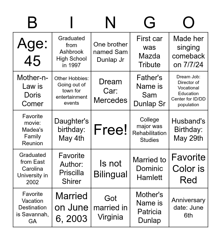 This bingo card has a free space and 28 words: Favorite Color is Red, Favorite Hobby is Shopping, Father's Name is Sam Dunlap Sr, Mother's Name is Patricia Dunlap, Mother-n-Law is Doris Comer, One brother named Sam Dunlap Jr, Graduated from Ashbrook High School in 1997, Graduated from East Carolina University in 2002, College major was Rehabilitation Studies, Favorite Vacation Destination is Savannah, GA, Favorite movie: Madea's Family Reunion, First car was Mazda Tribute, Married on June 6, 2003, Got married in Virginia, Dream Job: Director of Vocational Education Center for ID/DD population, Favorite Singer: Anthony Hamilton, Favorite Author: Priscilla Shirer, Other Hobbies: Going out of town for entertainment events, Dream Car: Mercedes, Is not Bilingual, Age: 45, Birthday: June 10th, Anniversary date: June 6th, Daughter's birthday: May 4th, Husband's Birthday: May 29th, Married to Dominic Hamlett, Made her singing comeback on 7/7/24 and Officially became 1st Lady of Mt Zion on August 1, 2021.