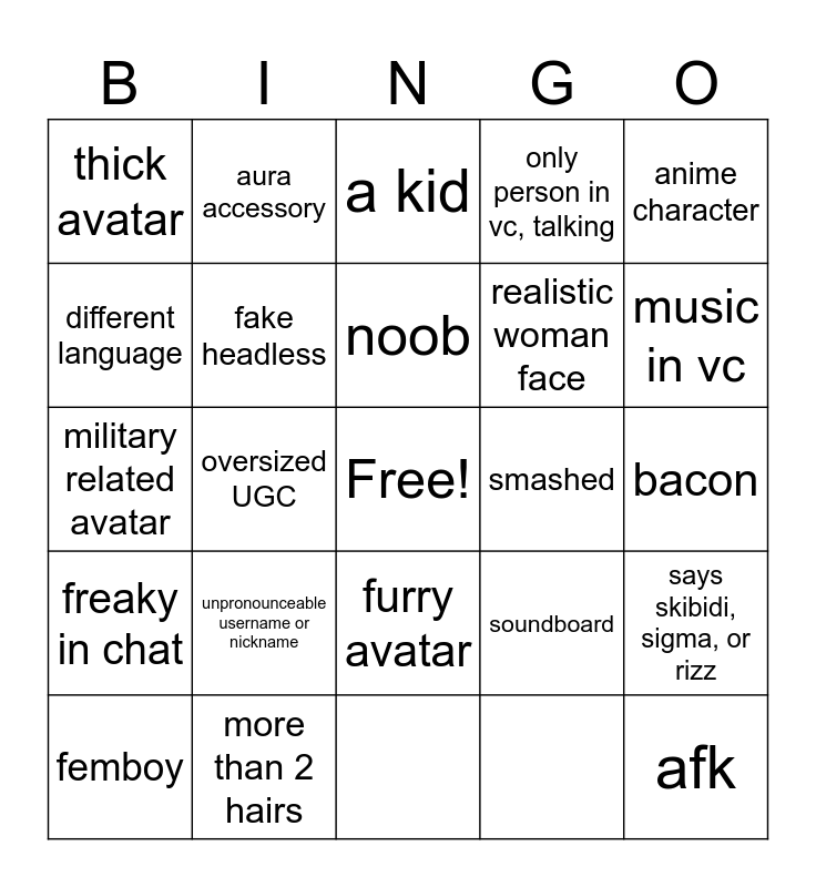 This bingo card has a free space and 22 words: smashed, says skibidi, sigma, or rizz, aura accessory, soundboard, different language, fake headless, thick avatar, a kid, military related avatar, freaky in chat, realistic woman face, only person in vc, talking, unpronounceable username or nickname, furry avatar, bacon, more than 2 hairs, oversized UGC, afk, music in vc, anime character, noob and femboy.