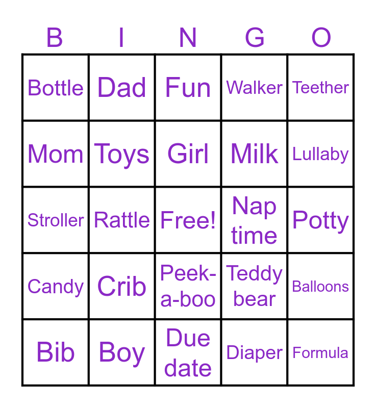 This bingo card has a free space and 24 words: Crib, Boy, Girl, Bib, Teether, Bottle, Mom, Dad, Nap time, Peek-a-boo, Milk, Stroller, Teddy bear, Balloons, Toys, Diaper, Potty, Fun, Lullaby, Rattle, Formula, Candy, Walker and Due date.