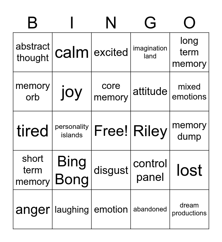 This bingo card has a free space and 39 words: mind, fear, sadness, joy, anger, disgust, core memory, headquarters, long term memory, short term memory, personality islands, imagination land, dream productions, memory dump, Riley, Bing Bong, train of thought, abstract thought, subconscious, control panel, memory orb, emotion, attitude, mixed emotions, memory recall, mind manual, explode, awkward, boredom, calm, relief, curious, excited, laughing, abandoned, disappointed, lost, tired and worried.