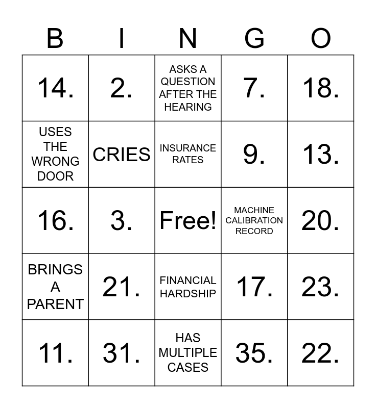 This bingo card has a free space and 72 words: 1., 2., 3., 4., 5., 6., 7., 8., 9., 10., 11., 12., 13., 14., 15., 16., 17., 18., 19., 20., 21., 22., 23., 24., 25., 26., 27., 28., 29., 30., 31., 32., 33., 34., 35., 36., DISMISS ID, ASKS FOR LENIENCY, USES THE WRONG DOOR, DOESNT QUALIFY FOR DDC, FINANCIAL HARDSHIP, BRINGS IN EVIDENCE, FTA, POINTS, DRESSES UP (CHURCH CLOTHES), BRINGS A PARENT, "IT WASN'T ME", HEARING, THE SIGNS WERENT OUT, JUDGE GETS INTURRUPTED, "IT WAS DARK OUT", JUDGE MENTIONS PIE, BALIFF EXCHANGE, MACHINE CALIBRATION RECORD, DOCTOR/ HEALTCARE PROFESSIONAL, WEARS NON-COURT APPROPRIATE CLOTHES (LOOKS LIKE A HOOKER), ASKS A QUESTION AFTER THE HEARING, INSURANCE RATES, ARGUES SERVICE, MENTIONS THEY'RE A VET/LEO, MENTIONS THEY'RE A SAFE DRIVER, HOLDING UP THE SHOW, MEDICAL EMERGENCY, HAS MULTIPLE CASES, THE SIGNS WEREN’T THERE WHEN I WENT BACK (MOBILE SITE MOVED)., UBER/LYFT DRIVER, CRIES, DEFENDANTS TESTIMONY DOESN'T MAKE SENSE, WRONG COURTROOM, BRINGS IN ACTUAL DRIVER, RATS ON DRIVER (UNPROMPTED) and HAS A CDL.
