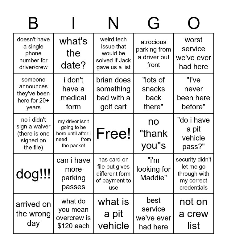 This bingo card has a free space and 24 words: can i have more parking passes, what do you mean overcrew is $120 each, brian does something bad with a golf cart, arrived on the wrong day, worst service we've ever had here, doesn't have a single phone number for driver/crew, someone announces they've been here for 20+ years, what's the date?, no "thank you"s, has card on file but gives different form of payment to use, "lots of snacks back there", no i didn't sign a waiver (there is one signed on the file), "i'm looking for Maddie", security didn't let me go through with my correct credentials, i don't have a medical form, best service we've ever had here, "do i have a pit vehicle pass?", weird tech issue that would be solved if Jack gave us a list, "I've never been here before", my driver isn't going to be here until after i need ____ from the packet, not on a crew list, dog!!!, atrocious parking from a driver out front and what is a pit vehicle.