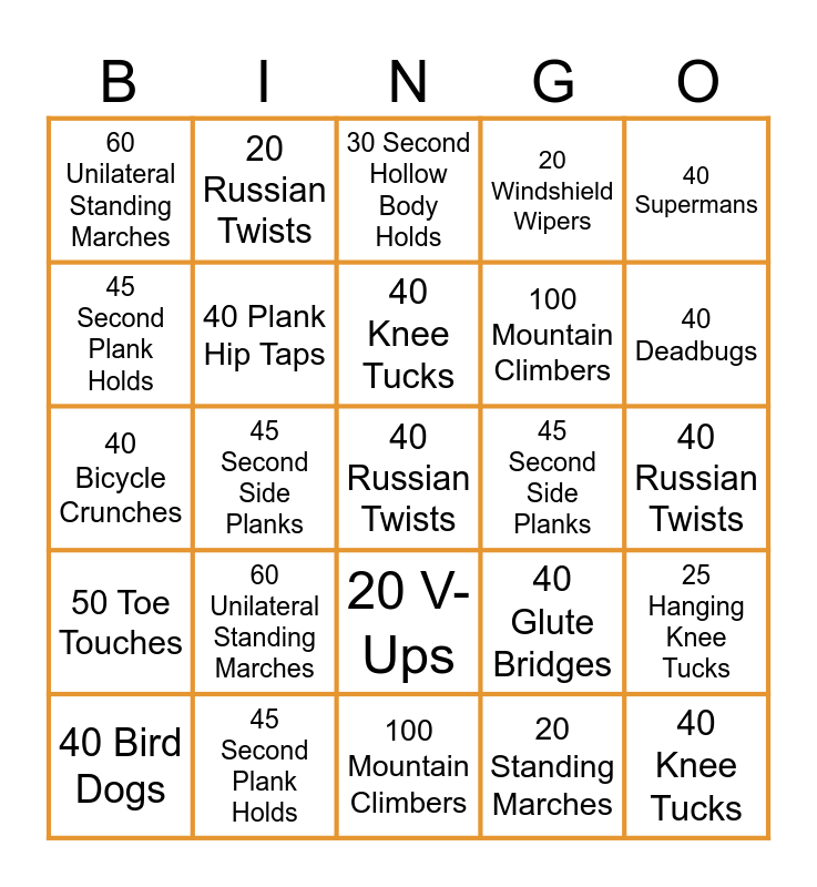 This bingo card has 60 words: 50 Sit Ups, 45 Second Plank Holds, 30 Spidermans, 50 Toe Touches, 20 Standing Marches, Pick Any Exercise w/ Resistance, 40 Plank Hip Taps, 32 Supermans, 100 Mountain Climbers, 30 Leg Raises, 20 Windshield Wipers, 100 Crunches, 45 Second Plank Holds, 40 Bicycle Crunches, 20 Plank Hi/Lo, 60 Unilateral Standing Marches, 40 Russian Twists, 40 Supermans, 100 Mountain Climbers, 40 Knee Tucks, 45 Second Side Planks, 30 Second Hollow Body Holds, 40 Bird Dogs, 25 Hanging Knee Tucks, 20 V-Ups, 100 Mountain Climbers, 40 Shotguns, 30 Spidermans, 40 Deadbugs, Pick Any Exercise of Choice/w Resist, 50 Sit Ups, 45 Second Plank Holds, 40 Bicycle Crunches, 16 Standing Marches, 20 Russian Twists, 100 Mountain Climbers, 30 Leg Raise, 45 Second Side Planks, 45 Second Plank Holds, 40 Bicycle Crunches, 20 Plank Hi/Lo, 60 Unilateral Standing Marches, 40 Russian Twists, 40 Supermans, 40 Glute Bridges, 30 Leg Raise, 25 Second Hollow Body Holds, 40 Bird Dogs, 25 Hanging Knee Tucks, 20 V-Ups, 100 Mountain Climbers, Pick Any Exercise of Choice/w Resist, 30 Spidermans, 40 Deadbugs, 40 Plank Hip Taps, 20 Windshield Wipers, 50 Toe Touches, 40 Shotguns, 40 Knee Tucks and 100 Crunches.