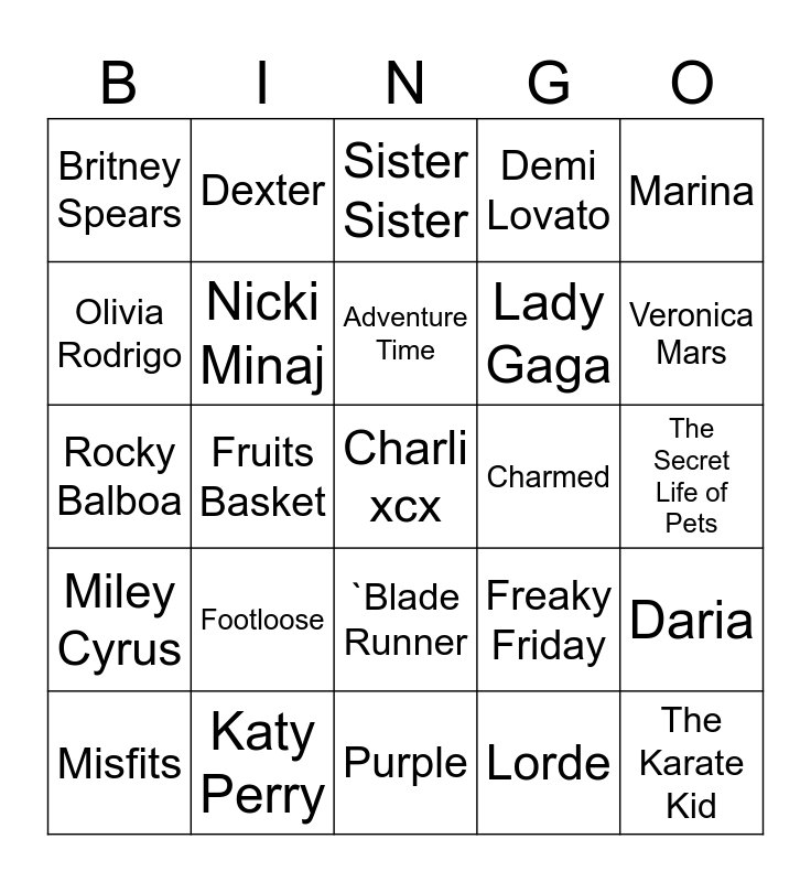 This bingo card has 59 words: Chappell Roan, Katy Perry, Lizzo, Miley Cyrus, Lorde, Lil Mama, Nicki Minaj, Icona Pop, Lady Gaga, Kesha, Demi Lovato, Sabrina Carpenter, Olivia Rodrigo, Dua Lipa, Christina Aguilera, Britney Spears, Charli xcx, Marina, Pushing Daisies, Adventure Time, Charmed, Sister Sister, Misfits, Daria, Felicity, Twin Peaks, CSI: Las Vegas, So Weird, Veronica Mars, Buffy the Vampire Slayer, Pokemon, Code Lyoko, iZombie, Grounded for Life, Dexter, Pretty Little Liars, Degrassi, Fruits Basket, The Wolf of Wall Street, Rocky Balboa, Victorious, Footloose, The Secret Life of Pets, 21, Wizards of Waverly Place, The Great Gatsby, Toy Story, Work It, `Blade Runner, Purple, The Office, Baywatch, Raising Cane’s, Dawson’s Creek, Beyoncé, Freaky Friday, Born on the Fourth of July, The Karate Kid and Lamar Odom.