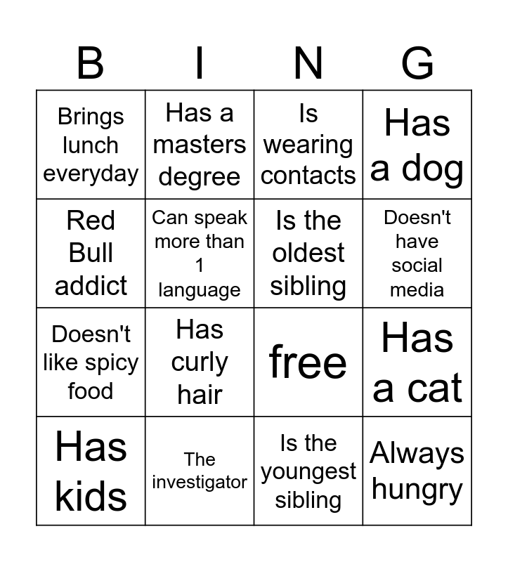 This bingo card has 16 words: The investigator, Has a cat, Is wearing contacts, Brings lunch everyday, Doesn't like spicy food, Has a masters degree, free, Is the youngest sibling, Red Bull addict, Can speak more than 1 language, Has kids, Has a dog, Has curly hair, Doesn't have social media, Is the oldest sibling and Always hungry.