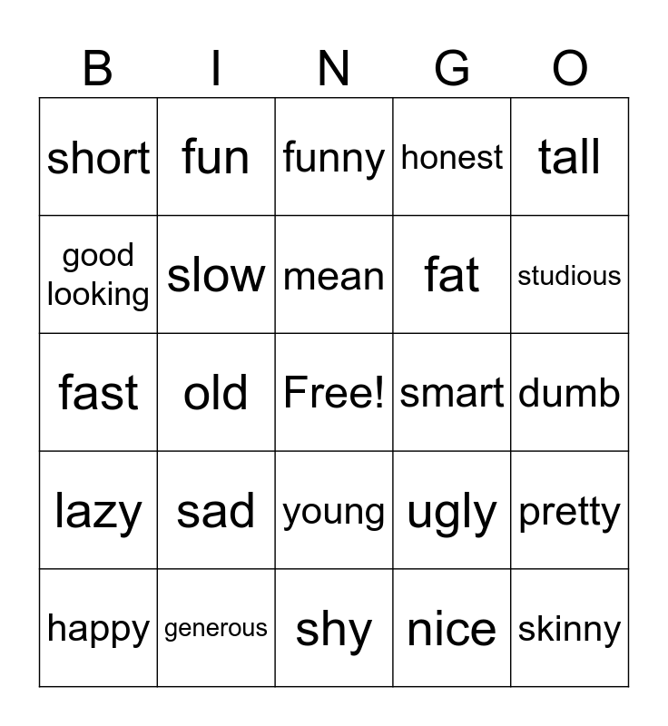 This bingo card has a free space and 24 words: happy, sad, mean, nice, tall, short, fun, funny, smart, dumb, fast, slow, ugly, pretty, good looking, generous, shy, honest, studious, lazy, old, young, fat and skinny.