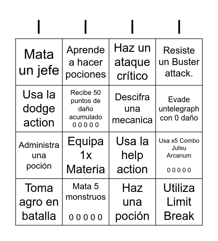 This bingo card has 16 words: Mata 5 monstruos 0 0 0 0 0, Usa x5 Combo Jutsu Arcanum 0 0 0 0 0, Haz un ataque crítico, Mata un jefe, Administra una poción, Aprende a hacer pociones, Usa la help action, Haz una poción, Usa la dodge action, Recibe 50 puntos de daño acumulado 0 0 0 0 0, Toma agro en batalla, Resiste un Buster attack., Equipa 1x Materia, Evade untelegraph con 0 daño, Descifra una mecanica and Utiliza Limit Break.