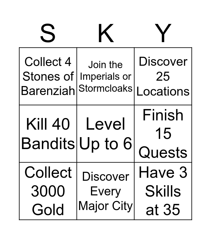 This bingo card has 9 words: Collect 3000 Gold, Discover 25 Locations, Join the Imperials or Stormcloaks, Kill 40 Bandits, Collect 4 Stones of Barenziah, Finish 15 Quests, Level Up to 6, Have 3 Skills at 35 and Discover Every Major City.