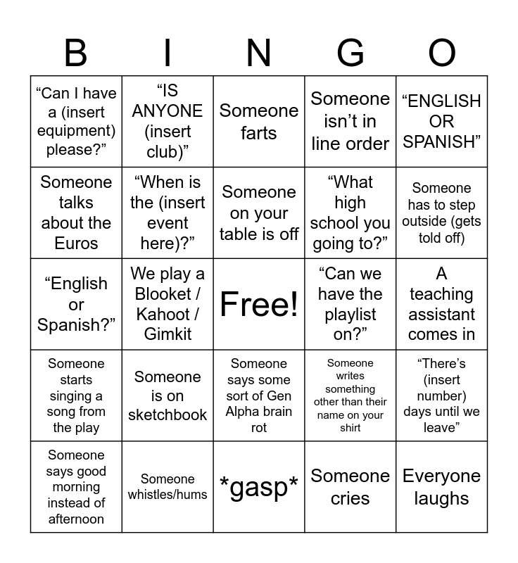 This bingo card has a free space and 28 words: “There’s (insert number) days until we leave”, Someone gets angry over Dojo Island, “What high school you going to?”, Someone cries, Someone talks about the Euros, Someone farts, “IS ANYONE (insert club)”, Someone starts singing a song from the play, “Can we have the playlist on?”, Someone says good morning instead of afternoon, “English or Spanish?”, Someone isn’t in line order, Someone whistles/hums, *gasp*, Someone has to step outside (gets told off), “(insert name) LIKES (insert name)”, Someone is on sketchbook, “When is the (insert event here)?”, Someone on your table is off, Someone says some sort of Gen Alpha brain rot, “Can I have a (insert equipment) please?”, Someone does a handclap, Everyone laughs, We play a Blooket / Kahoot / Gimkit, A teaching assistant comes in, Someone writes something other than their name on your shirt, “ENGLISH OR SPANISH” and You spot your name on someone else’s leaver’s hoodie.