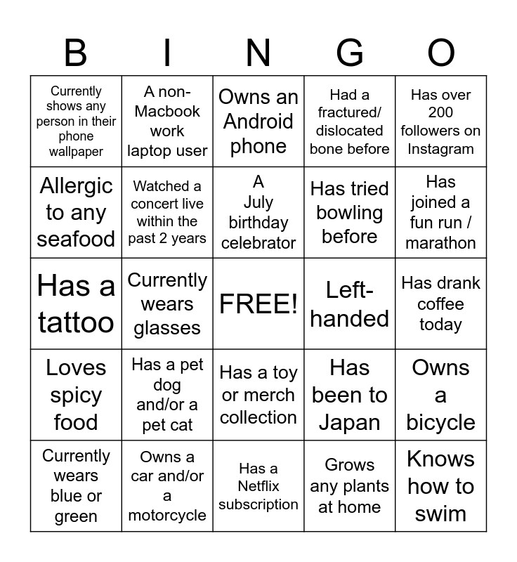 This bingo card has a free space and 24 words: Has a pet dog and/or a pet cat, Owns a car and/or a motorcycle, A July birthday celebrator, Currently wears blue or green, Has over 200 followers on Instagram, Currently shows any person in their phone wallpaper, Allergic to any seafood, A non-Macbook work laptop user, Left-handed, Has a toy or merch collection, Has tried bowling before, Has a tattoo, Has been to Japan, Owns a bicycle, Watched a concert live within the past 2 years, Grows any plants at home, Has drank coffee today, Owns an Android phone, Has joined a fun run / marathon, Currently wears glasses, Knows how to swim, Loves spicy food, Had a fractured/ dislocated bone before and Has a Netflix subscription.