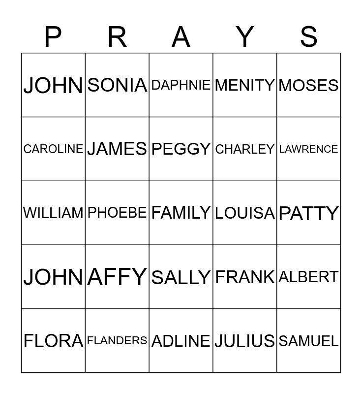 This bingo card has a free space and 24 words: AFFY, FLANDERS, PEGGY, FLORA, MOSES, JOHN, CAROLINE, SONIA, LOUISA, SALLY, CHARLEY, WILLIAM, FRANK, ALBERT, JAMES, JULIUS, PATTY, DAPHNIE, LAWRENCE, PHOEBE, SAMUEL, JOHN, MENITY and ADLINE.