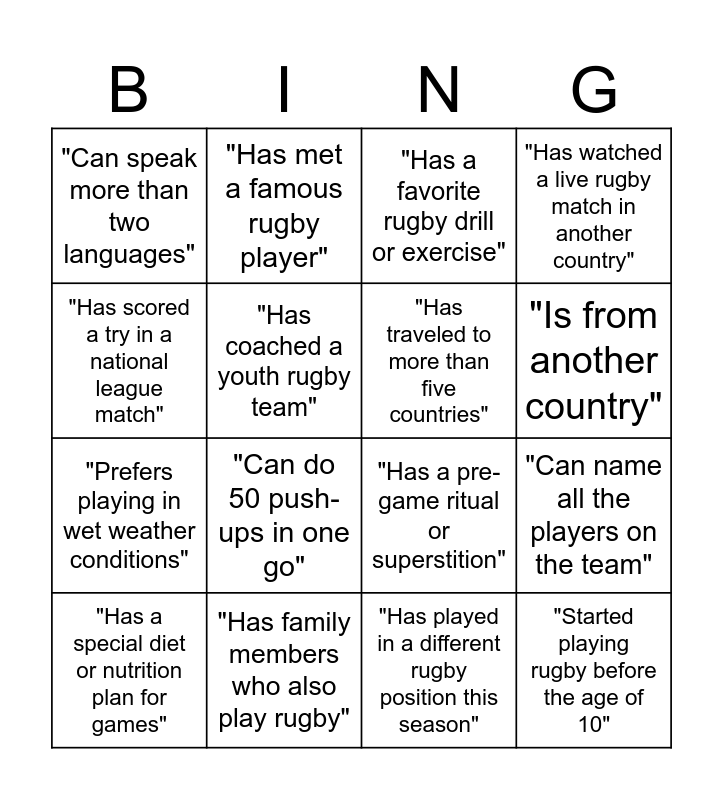 This bingo card has 26 words: Free!, Has played rugby for over 10 years", "Is from another country", "Has a hidden talent", "Has scored a try in a national league match", "Can speak more than two languages", "Has coached a youth rugby team", "Has met a famous rugby player", "Has played in a different rugby position this season", "Has attended a rugby world cup", "Prefers playing in wet weather conditions", "Has a pre-game ritual or superstition", "Has been part of a championship-winning team", "Has suffered a significant injury and recovered", "Can name all the players on the team", "Has a rugby-related nickname", "Has watched a live rugby match in another country", "Started playing rugby before the age of 10", "Has a favorite rugby drill or exercise", "Has a special diet or nutrition plan for games", "Can do 50 push-ups in one go", "Has volunteered at a rugby event", "Has family members who also play rugby", "Can explain a complex rugby rule", "Has traveled to more than five countries" and "Is wearing rugby socks right now".
