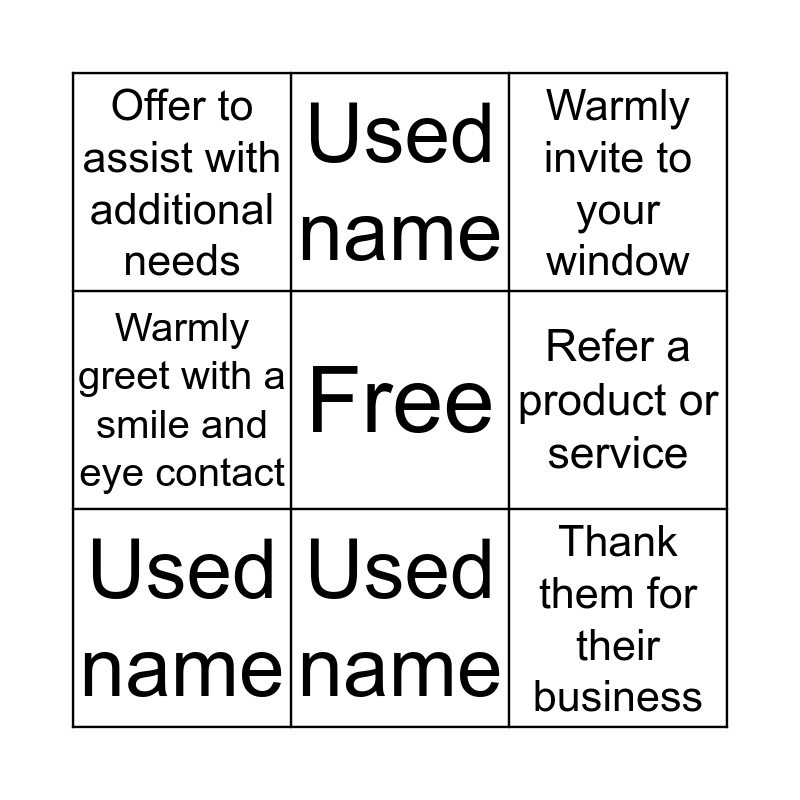 This bingo card has a free space and 8 words: Refer a product or service, Warmly invite to your window, Used name, Used name, Offer to assist with additional needs, Thank them for their business, Warmly greet with a smile and eye contact and Used name.