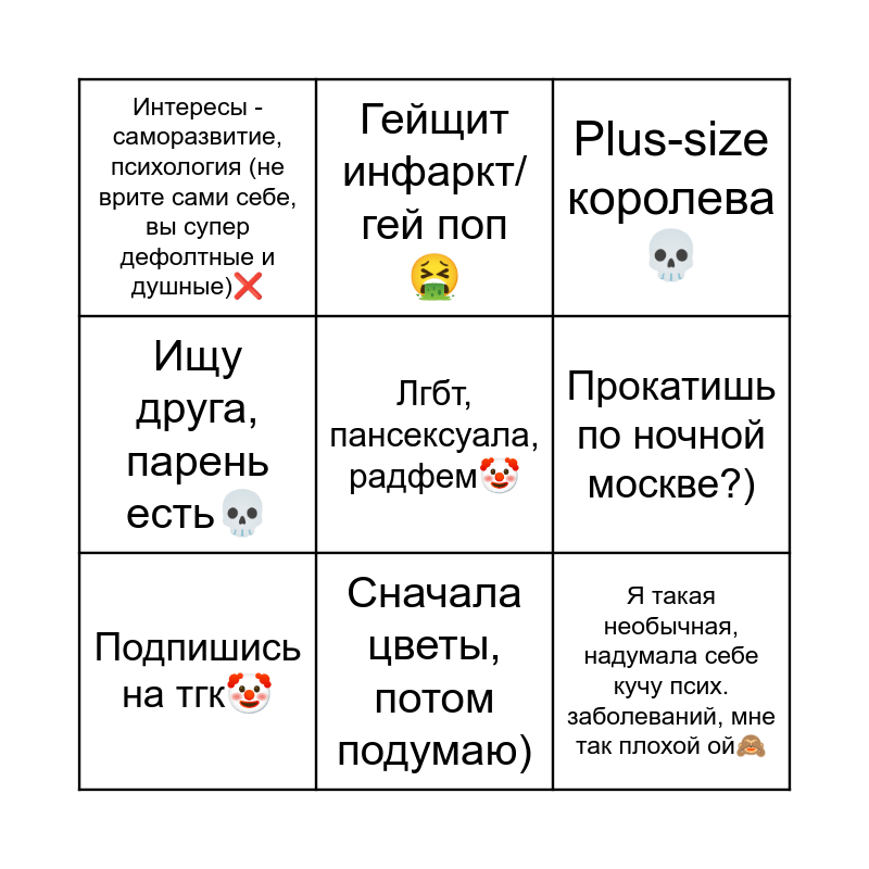 This bingo card has a free space and 8 words: Прокатишь по ночной москве?), Plus-size королева💀, Гейщит инфаркт/ гей поп 🤮, Подпишись на тгк🤡, Интересы - саморазвитие, психология (не врите сами себе, вы супер дефолтные и душные)❌, Я такая необычная, надумала себе кучу псих. заболеваний, мне так плохой ой🙈, Ищу друга, парень есть💀 and Сначала цветы, потом подумаю).