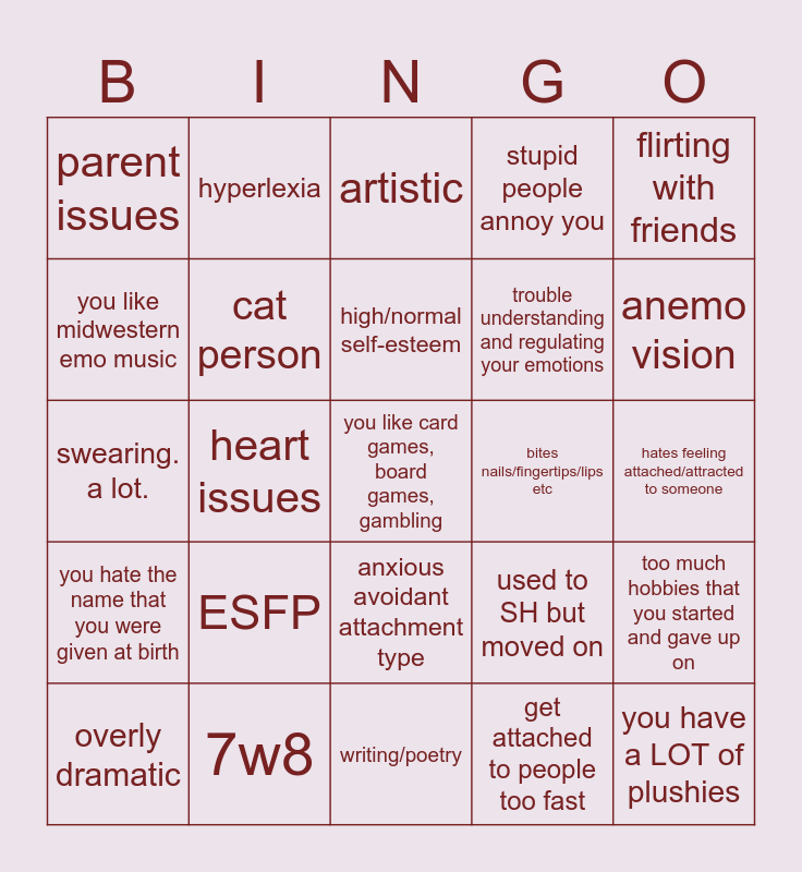 This bingo card has a free space and 24 words: ESFP, 7w8, high/normal self-esteem, overly dramatic, flirting with friends, parent issues, you like midwestern emo music, hyperlexia, bites nails/fingertips/lips etc, anxious avoidant attachment type, trouble understanding and regulating your emotions, swearing. a lot., used to SH but moved on, too much hobbies that you started and gave up on, cat person, get attached to people too fast, hates feeling attached/attracted to someone, artistic, anemo vision, heart issues, you have a LOT of plushies, you hate the name that you were given at birth, stupid people annoy you and writing/poetry.