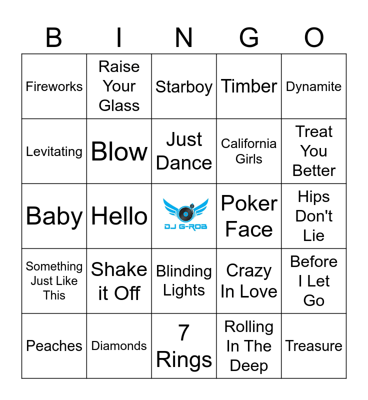This bingo card has a free space and 50 words: 24K Magic, Treasure, Thank U, Next, 7 Rings, Shake it Off, Blank Space, Raise Your Glass, U & Ur Hand, Levitating, Don't Start Now, Blow, Timber, Before I Let Go, Crazy In Love, Bad Guy, Bury A Friend, Just Dance, Poker Face, Idol, Dynamite, Hello, Rolling In The Deep, Fireworks, California Girls, Shape Of You, I Don't Care, Treat You Better, Stitches, Starboy, Blinding Lights, Lemon, Work, Truth Hurts, Juice, Diamonds, Dancing With A Stranger, Party In The USA, Wrecking Ball, Chantaje, Hips Don't Lie, Good Feeling, Low, Watermelon Sugar, Kiwi, Peaches, Baby, Better Now, Wow, Something Just Like This and Closer.