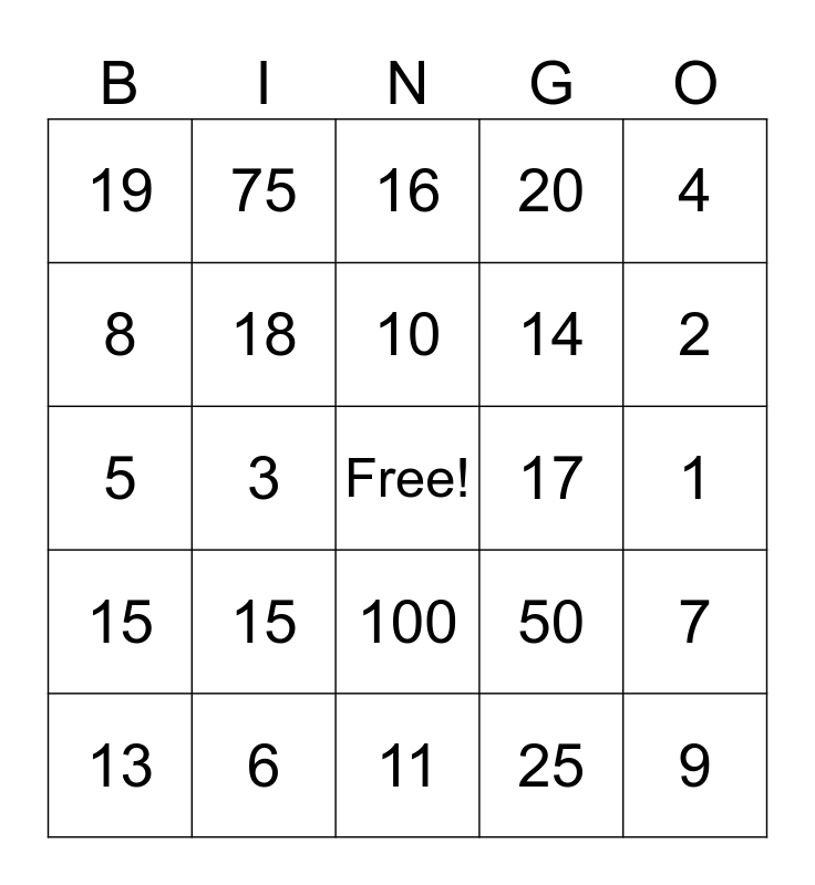 This bingo card has a free space and 24 words: 15, 6, 10, 13, 4, 19, 8, 75, 17, 100, 14, 5, 50, 7, 18, 25, 1, 16, 2, 3, 9, 15, 20 and 11.